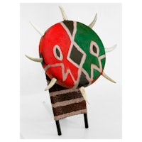 Patriot, acrylic paint, oil paint, primer, star bead, elk tips, wire, wax teeth and canvas on car seat head rest, 17” x 10” x 5”, 2025