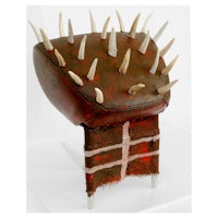 Split, primer, oil paint, wire, caulk, elk tips, and twine on car seat headrest, 15” x 12” x 5.5”, 2025